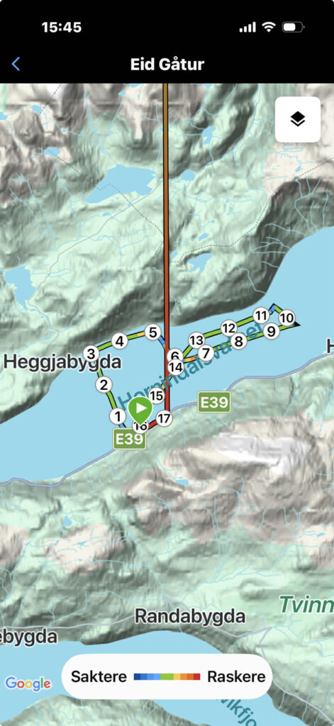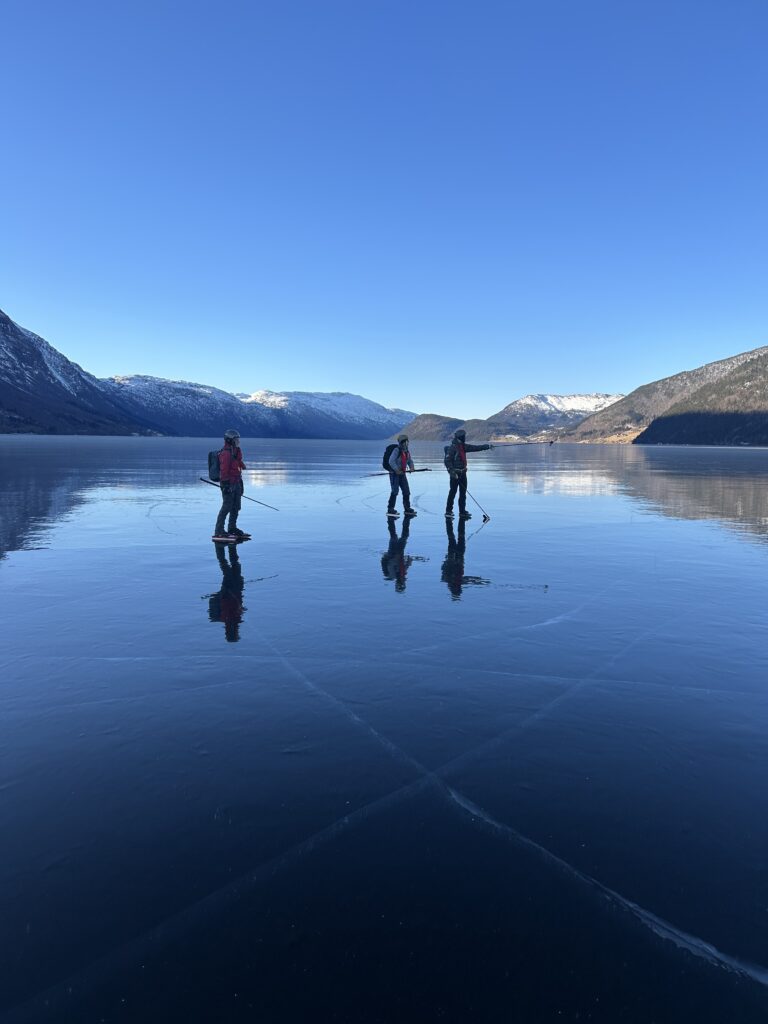 For det er en glede – en stor glede, å gli nærmest lydløst og friksjonsfritt – med enkelt skøyteteknikk, gode stål og turskisko med BC binding. Vi opplevde ingen dramatikk, vi hadde hele den store isen for oss selv, og fikk 12 blanke kilometer på skøyteeggen, før vi ble lokket av rykter om god skøyteis på Austrefjorden innafor Volda. Vi måtte selvsagt dit også, før vi tok turen tilbake til Østlandet. Mer om det senere.